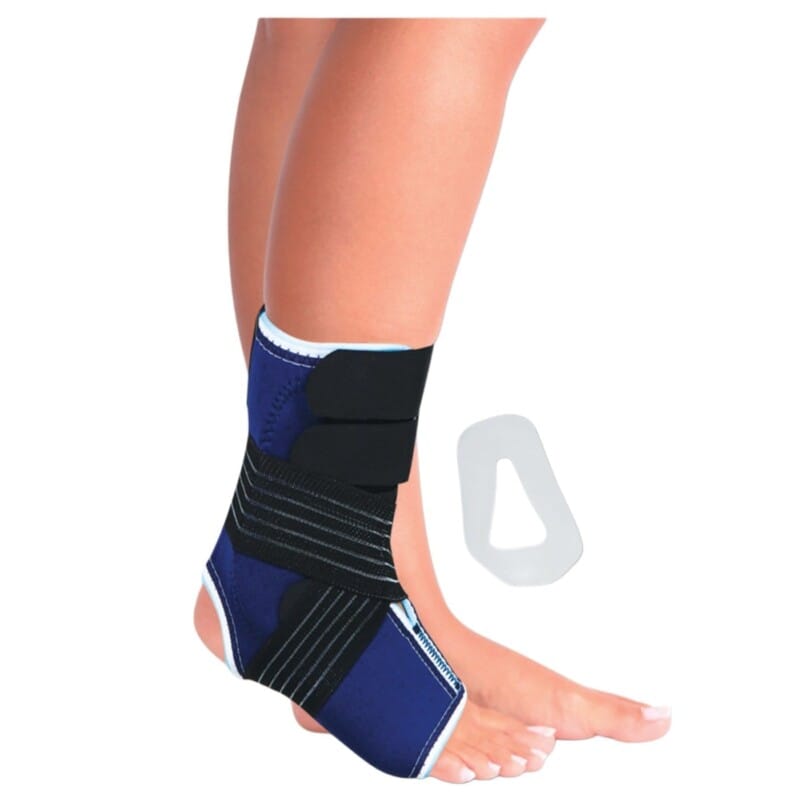 une plaque malléolaire en plastique plus un tissu néoprène avec bande croisée.